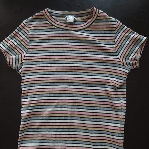 Vaaleanpuna-keltaraitainen t-paita, kokoa XXS.