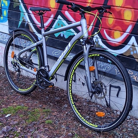 Toimiva ja hyväkuntoinen hybridi pyörä kapeilla asfaltti renkailla.