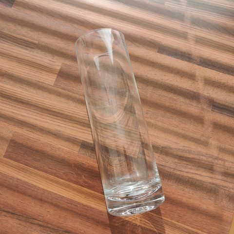 Lasinen maljakko, korkeus 16,7 cm. Halkaisija yläosasta 15 cm.