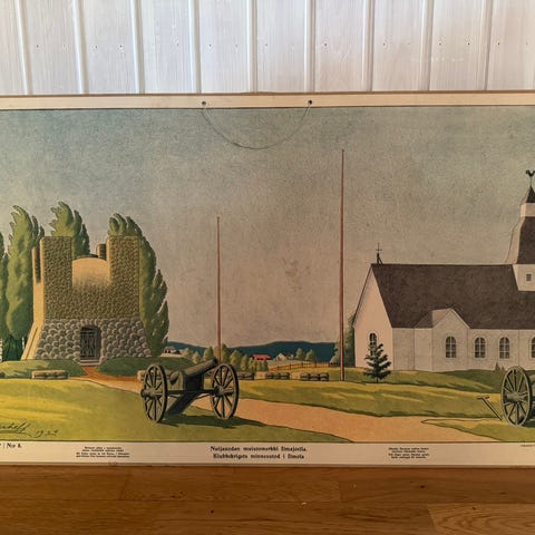 Vanha kansakouluaikainen opetustaulu aiheena Hämeen linna. Kuten kuvasta näkee, kunto on erinomainen ikäänsä nähden ja taulu on todella hyvin säilytetty.