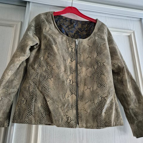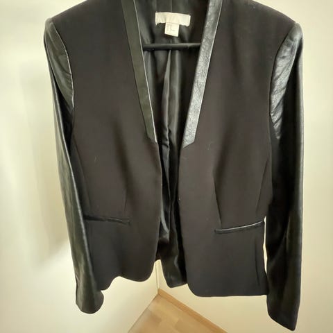 Vähän käytetty, tekonahkakaulus sekä avoimissa taskuissa tekonahkaiset läpät.