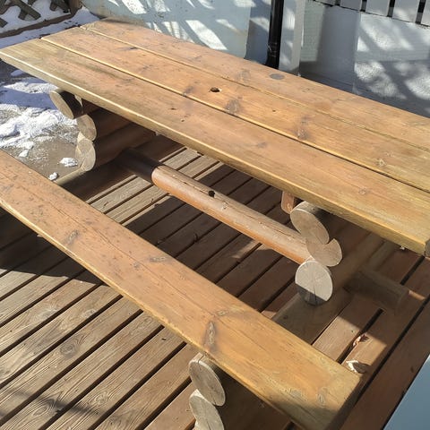 Tukeva hirsipöytä/istuimet, yhtenäinen paketti, istuinosat ja pöydän ns.kansiosa irrotettavat. Tarjouksien perusteella.