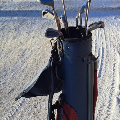 Naisten puolikas vasenkätinen golfsetti kantobägissä, muutamasti käytetty ja hyvässä kunnossa. 3, 5, 7, 9, S, putteri ja erikseen ostettu 1. Vain nouto.