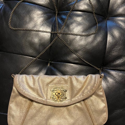 Accessorize laukku, jossa kaunis kukkakirjonta ja näyttäviä niittiyksityiskohtia. Pohjaväri: musta. Vetoketjukiinnitys. Laukun sisäpuolella yksi vetoketjutasku ja kaksi avotaskua. Säädettävä olkahihna, jonka saa halutessaan kokonaan irti. Päällinen 100 % polyuretaania; vuorikangas 100 % polyesteria. Leveys yläosasta noin 30 cm ja alaosasta noin 31 cm. Korkeus on noin 22 cm. Toimii hyvin myös tablettilaukkuna. Uudenveroisessa kunnossa.