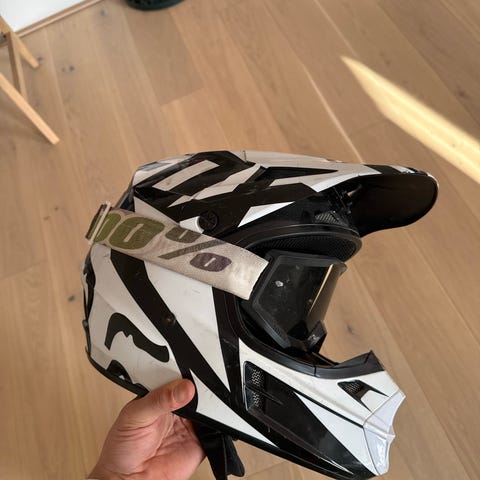 Nelisen vuotta vanha Foxin kypärä. Ehjä, mutta käytön jälkiä löytyy.