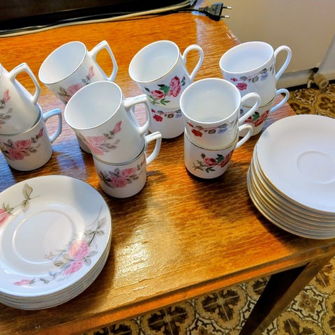 Kauniit Puolalaiset kahvikupit ja asetit. Kupit 4 kpl, korkeus 7 cm, halkaisija 8,5 cm. Asetit 5 kpl, halkaisija 13 cm. Kauniit kullanväriset kuvioinnit. Ehjät ja siistit. Postitus tai nouto.