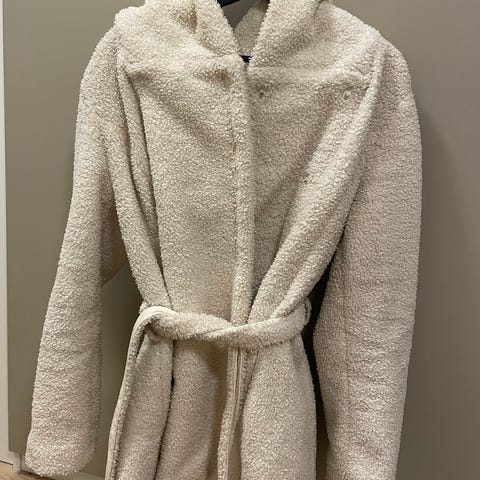Pari kertaa käytetty takki, pinta samettinen, vaaleanpunainen. Merkki LOST INK ja koko 48. Muhkea, lyhyt malli mutta leveyttä on hyvin, kainalo-kainalo 70cm, olka-helma 70cm. Taskut, napitus vetoketjun päällä, ei huppua.