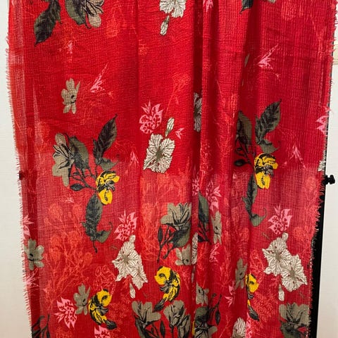 Keltainen iso huivi. Siisti. Yhdessä kohtaa pieni reikä mutta muuten ehjä. 100% Polyester. Mitat 190x83.