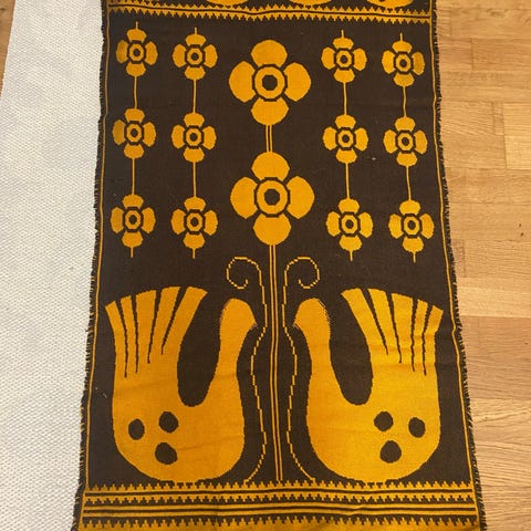 Todella siistikuntoinen seinävaate. Ehjä, ei tahroja. Nurjalla puolella nauhakuja. Koko 93 x 35 cm. Hp. 8 e + postikulut.