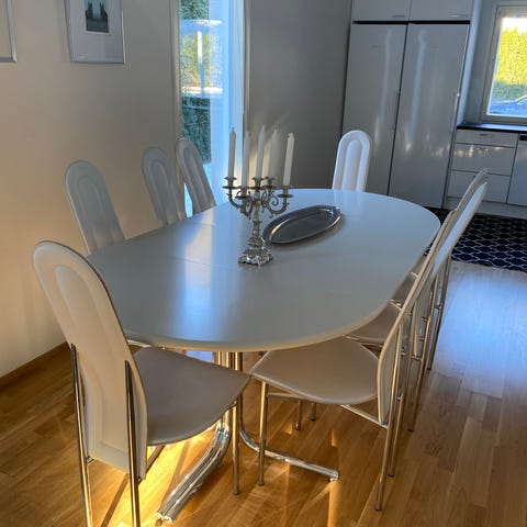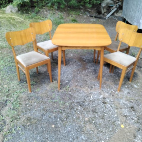 Tummanruskea Chippendale ruokapöytä L135 S105 K75 jatkopalalla L45 ja tuolit x 6 vaalealla verhoilulla.