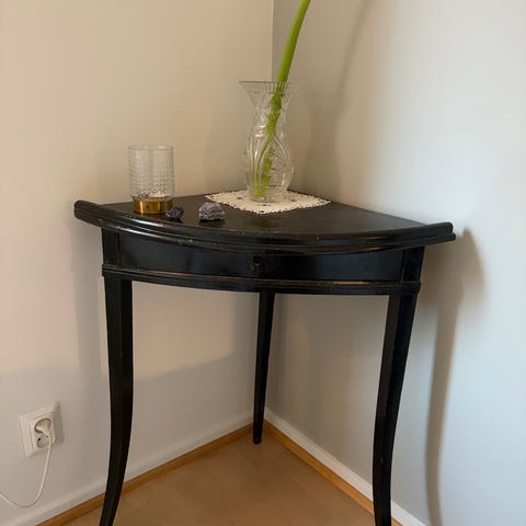 Vanha kiinalainen kahvipöytä. Luultavasti peräisin 1900-luvun alkupuoliskolta, tuotu Suomeen Belgiasta 2000-luvun alussa ja teetetty tällöin uusi lasi. Puuosissa on kulumia, mutta upotukset täysin ehjät. Hyväkuntoiset vastaavat maksavat Googlen mukaan maailmalla 1500-2500 euroa.