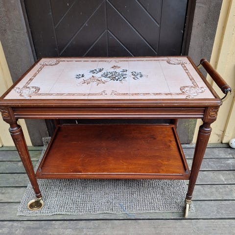 Kirsikanvärinen puinen Tarjoiluvaunu pyörillä, ylätaso huurrettu lasi. L50 S80 K77
