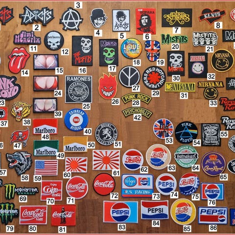 Rock n' Roll kangasmerkkejä: Elvis, Marilyn, Rollarit, Who, Pink Floyd jne...
