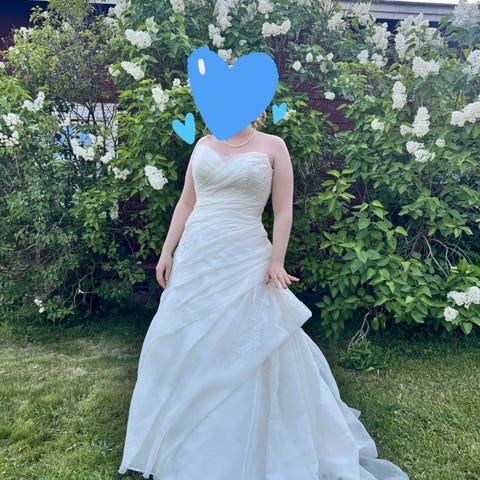 Uutena ostettu italialainen hääpuku. Puvussa korsettimainen paljettiyläosa ja todella upeasti laskeutuva alaosa upealla kankaalla (ei näy läpi) ja laahus. Ompelijalla lyhennetty ja lisätty kantonyöri helmaan jolla puku nousee maasta kauniisti. Itse olen 166cm + 6cm korot ja mekko tuolloin aivan maassa. Lyhennetyn kankaan saa mukaan. Korsetin alaosan ympärys noin vyötärön kohdalta 78cm. Puku pesetetään pesulassa ennen luovutusta. Saa sovittaa tietenkin :)