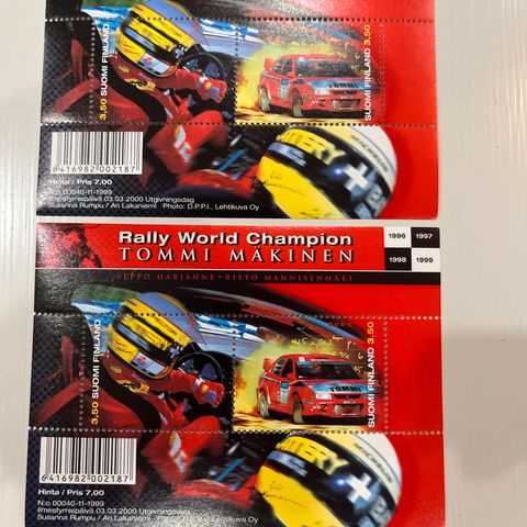 2 postimerkkiarkkia, Tommi Mäkinen Rally World Champion. Kummassakin 2 merkkiä. Kunto moitteeton. Nouto Vaasan keskustasta, käteismaksu. Yhteishinta 5e..