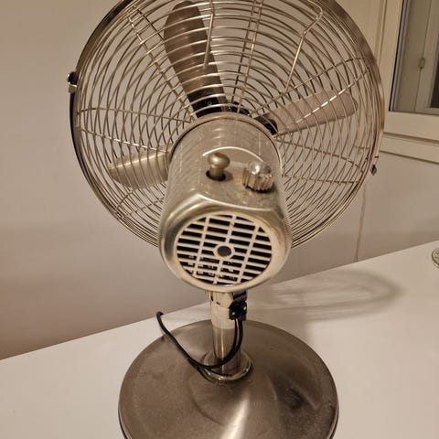 Oskilloiva, iso ja tehokas pöytätuuletin. Kehän halkaisija 45 cm, tuulettimen kokonaiskorkeus 58 cm. Kolme nopeutta. 40 W.