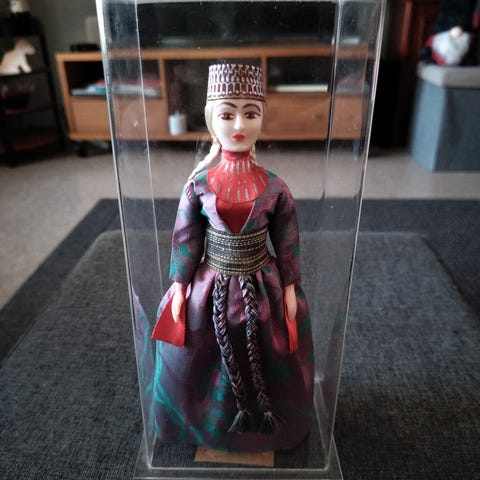 Nuken kasvot ovat kovaa materiaalia, vartalo kangasta, jonka sisällä painavahkoa raetta. Nukke pysyy hyvin istuvassa asennossa.