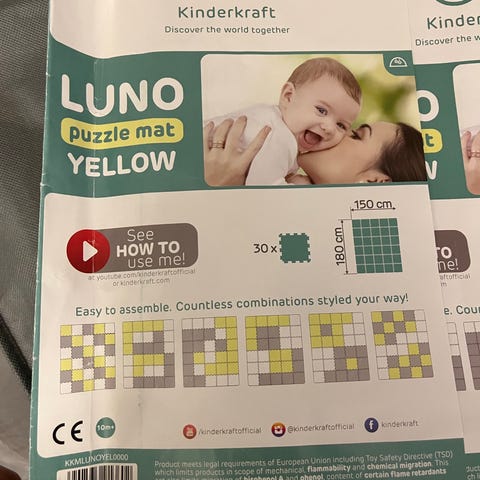 Kuluneita kohtia ja painaumia näkyy jonkun verran. Leikkimatto on kuitenkin siisti ja kaikki palat ovat ehjiä. Yhden oranssin palan päällys on hieman irronnut toisen puolen yhdestä kulmasta. Mukana tulee muutama ehjä harmaa varapala palojen kiinnitykseen.