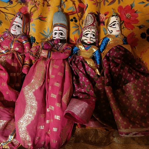 Nuket liimattuja puiseen alustaan. Kahden isoimman nuken käsiä voi jonkun verran liikuttaa. Koristeeksi tai leikkeihin.