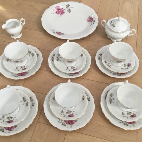 Myydään hienossa kunnossa oleva puolalainen tee-/kahviastiasto. Valkoinen kullatuin reunoin ja koristein