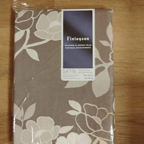 Paketissa oleva uusi keltainen Finlayson saarimuumi pussilakanasetti.