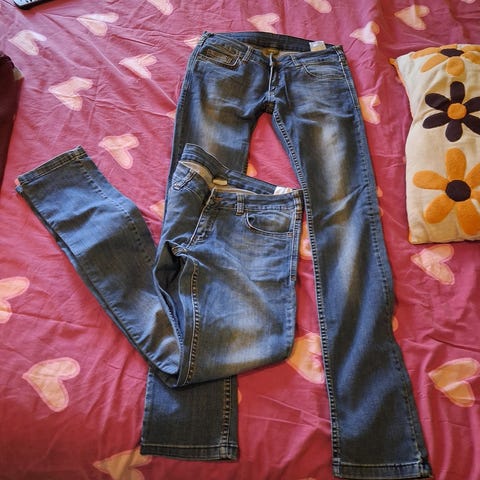 Kuvan harmaan mustat farkut pesuilla ja kulutuksilla. Tuoteseloste kuvassa.
