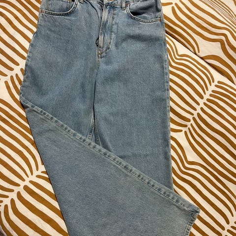 Kuvan vaalean siniset ohuehkoa farkkukangasta olevat haalari tyyppiset farkut. Tuoteseloste kuvassa.