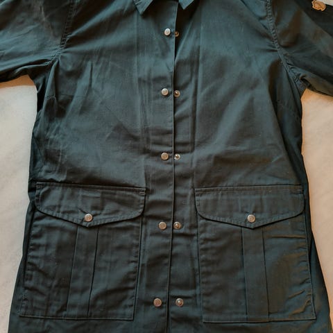 Hyväkuntoinen pieneksi jäänyt Fjällräven musta-beige takki vahattavaa G1000-kangasta. Käytössä mukavasti pehmentynyt, mutta täysin ehyt, lopulta melko vähän käytetty. Joitakin tahroja, joita ei ole yritetty erityisemmin poistaa, tarkempia kuvia voidaan laittaa. Tuoksuton ja lemmikkieläimetön talous.