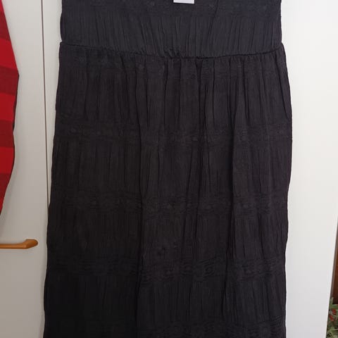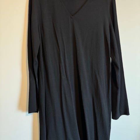 Musta, pitkä Tiger of Sweden -merkkinen, A-mallinen mekko ( tai vaikka äitiysmekko ) Mekossa on putous kaula-aukko, vetoketju ja epäsymmetrinen helma. Malli on väljä, ilmava ja mukava.