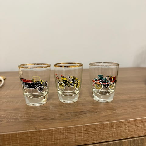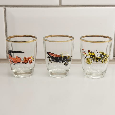 Kuuden pienen shottilasin sarja, jossa jokaisessa vanhan auton kuva. Ostettu käytettynä 1990-luvulla.