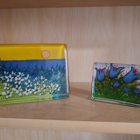 Heljä Liukko-Sundströmin lasinen laatta Lumous. Mukana ripustin. Kaunis lasitaulu ikkunaan, seinälle. Koko 43 x 35 cm.