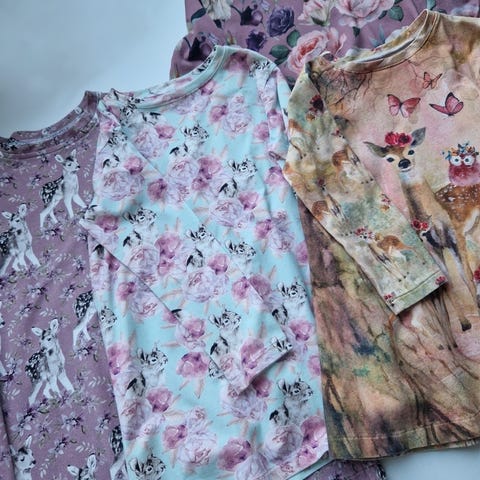 Neljä tunikaa, joissa myös taskut. Toisessa valkoisessa 2/3 hihat. Laadukkaita kankaita. Koko 110/116 cm. Viimeisessä kuvassa selkäkuvio. Kunto siisti ja ehjä, enkä tahrojaan löytänyt.