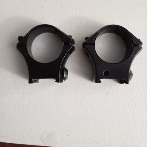 Masinatuotteen tekemä alumiininen jalusta. Käytetty aseessa kiinni, mutta ei ammuttu kertaakaan, jäi nyt tarpeettomaksi. Kunto täysin uudenveroinen. Renkaat 34 mm. Korkeuden puolesta riittää 56 mm etulinssillä varustetulle kiikarille. Tehty Tikka M55:een. Lupavapaa.