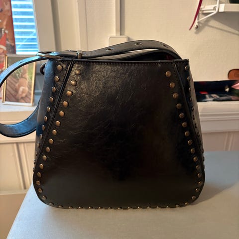 Punainen käsilaukku nahkaa, mitat noin leveys 40cm js korkeus 35cm. Uuden veroinen.