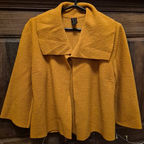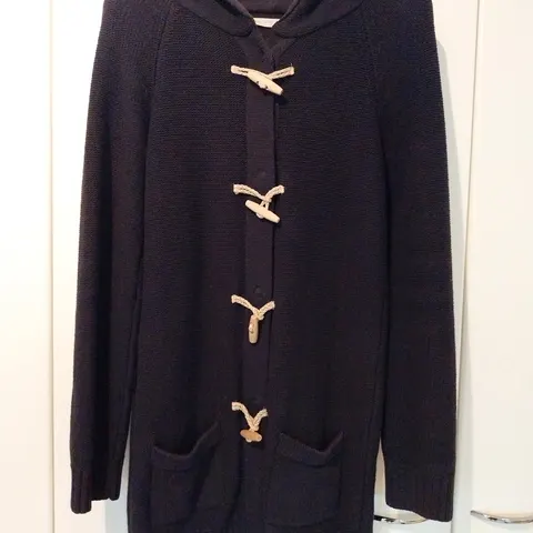 River Woods tummanlila neuletakki, koko S. Neuletakki kiinnitetään yhdellä napilla. Kaulus jatkuu kaulahuivina, kaulahuivin koko pituus on 142 cm. Kaulahuivia koristaa River Woodsin R-kirjain ja silkkirusetti. Neuletakin materiaali on lämmin ja pehmeä, 50% villa ja 50% akryyli. Erittäin hyväkuntoinen ja siisti.