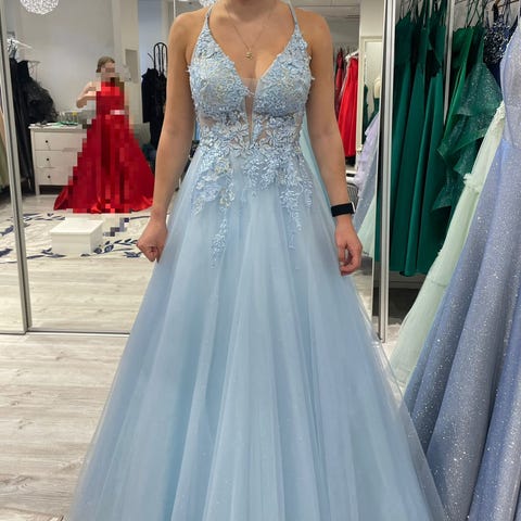 Vanhojentanssimekko koossa 32, takana nyörit, eli menee isommalle/pienemmällekin. Mukaan pukupussi, vannehame ja halutessaan koon 37 tanssikengät pienellä korolla.
