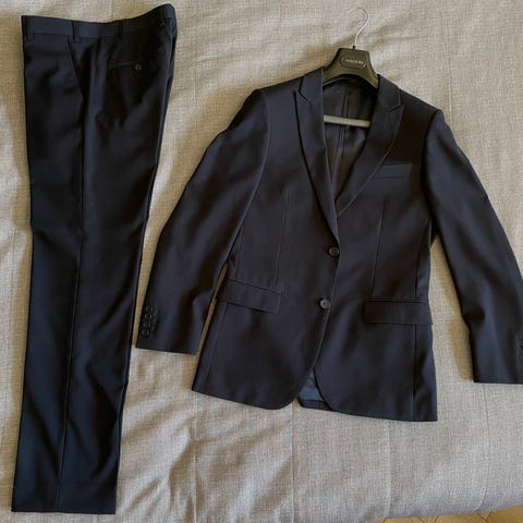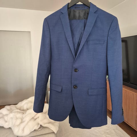 Sininen puku(takki ja housut), käytetty kerran