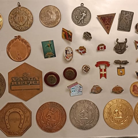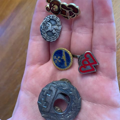 Vanhoja pinssejä, kalvosinnapit, mitali, hihamerkki..