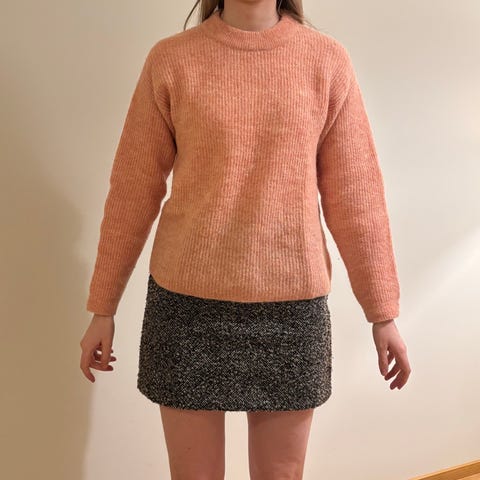 Vaaleanpunainen (hopealankoja seassa) ja kauniisti selästä avoin, löysä s-koon neule
