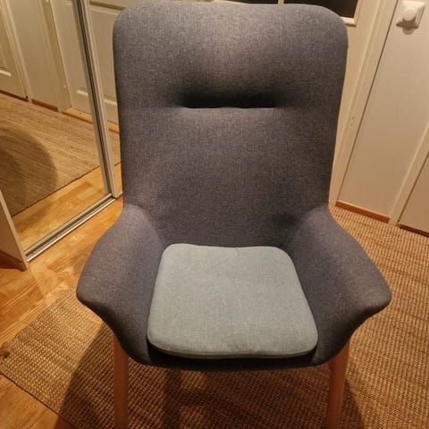 2x Ikea korkeaselkänojaista Vedbo -nojatuolia tummanharmaalla Gunnared-verhoilulla. Uudenveroiset. Mukaan Ikea Lisabo saarniviiluinen sohvapöytä, sopii sarjaan. Myynnissä edelleen hintaan 780€.