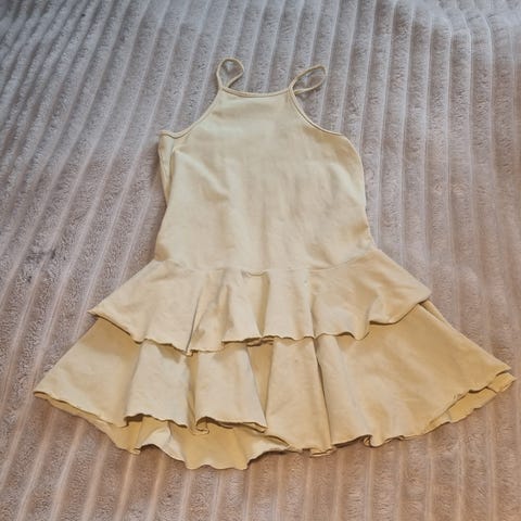 Keltainen pitkä mekko painijanselällä. Koko 128 cm. Muutama haalea tahra kuvassa 2, eivät pahemmin erota kuin tarkkaan katsoessa (huomioitu kuitenkin hinnassa). Väri vaaleankeltainen.
