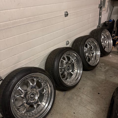 5x112 18 12,5 ja 10.5 leveät. Kumit tais olla 295/30 ja 255/30 leveet ja pintaa on. Takavanteiden et -35 joten ei ihan jokaiseen kikottimeen mene hettämällä, mutta näähän voi jokainen rakentaa mieleisekseen. Kiillotuksen vaatii..