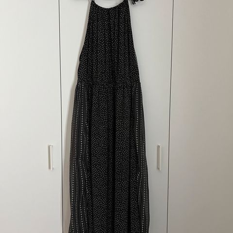 Hyväkuntoinen viskoosimekko, jota käytetty 1-2 kertaa. Eri levyiset etukappaleet. Oikealla kyljellä solmimisnauhat. Kainalo-kainalo n. 50 ja olka-helma n. 102 cm. Kangas joustaa.
