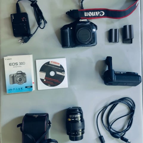 Canon EOS 30D järkkärin runko ja erikseen hankittu vakaimella varustettu objektiivi Canon EF-S 17-85mm f/4-5.6 IS USM