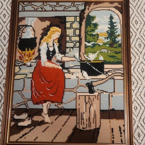 V. 1993 tehty Suojelusenkeli -kanavatyö, joka kehystetty tauluksi, koko 38x54 cm. Kullan värisen kehyksen paksuus 3,5 cm. Hyvässä kunnossa.