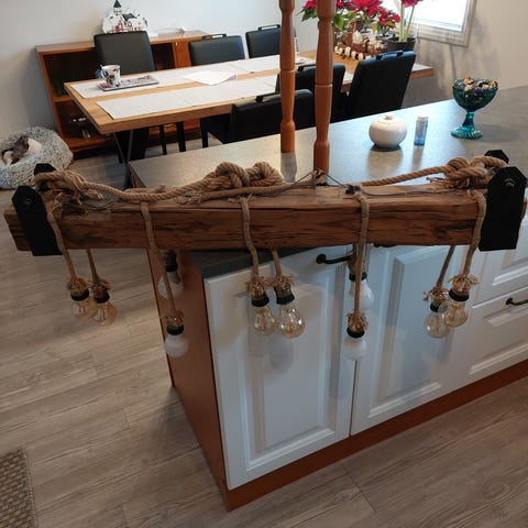 Tästä yksilöllinen, tunnelmallinen kattovalaisin kotiisi tai mökillesi. Sopii myös vaikka liiketiloihin. Umpipuuta. Noin 160-vuotta vanhaa mäntyä, vuosirenkaista laskettuna. Käsityönä hiottu. Alapuolella ja reunoilla kirkas kalustelakka, kontrastina yläpuolella kiiltävähkö musta maali. Ketjuilla roikkumaan. Lampun johto myös musta. Melko painava, vaatii kunnon koukun ja kiinnityskohdan. Halkaisija leveimmillään n. 50cm.