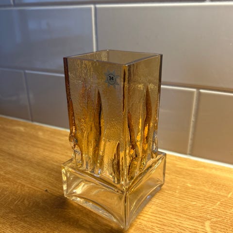Liekki-maljakko, Kumela Finland, suunnittelija Eino Vänni. Laatassa nimikirjaimet ja päivämäärä, ei häiritsevän isolla.