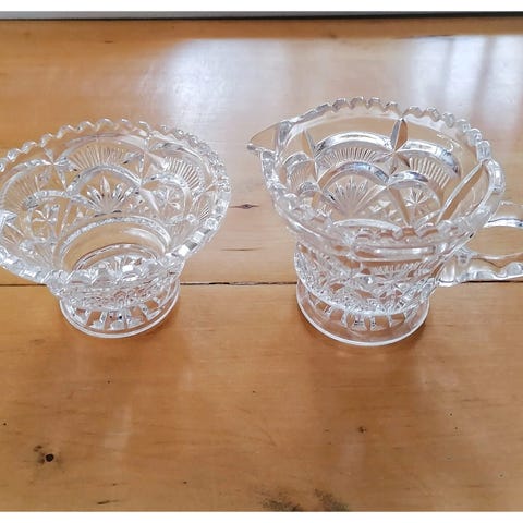 Riihimäen lasin vanha kristalli sokerikko ja kermakko. Sokerikon korkeus noin 8cm ja halkaisija noin 9.5cm. Yhteensä 18€.