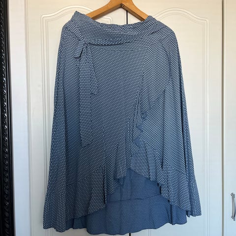 Myydään sähkösininen trikoohame, kuminauhavyötärö, vyötärönympärys venyttämättä 88 cm, pituus 69 cm. Voin postittaa.