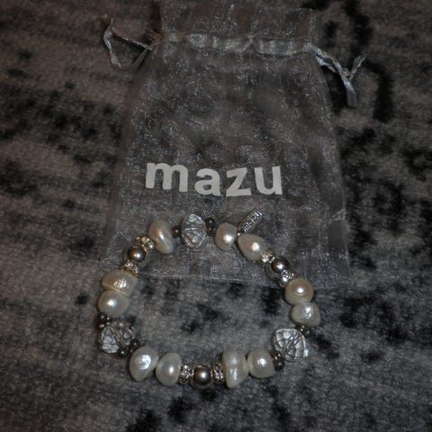 Uudenveroinen MAZU-rannekoru. Valkoisia ja lasinvärisiä helmiä. Käden läpi pujotettava malli.